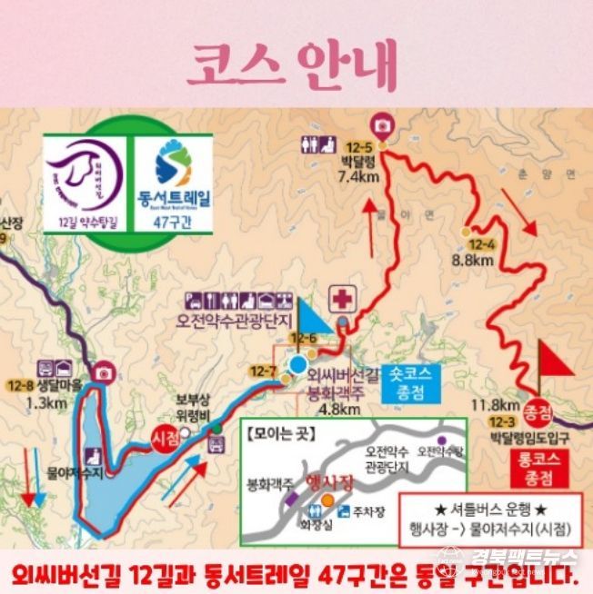 둘째 날인 6월 6일(토)에는 톡 쏘는 탄산 약수로 이름난 오전약수탕을 지나는 ‘약수탕길(12길)’힐링 코스가 이어진다. 가족 단위 참가자를 고려해 ▲숏코스(4.8km)와 ▲롱코스(11.8km)로 나누어 운영하며, 코스당 각각 250명씩 총 500명을 선착순 모집할 계획이다.