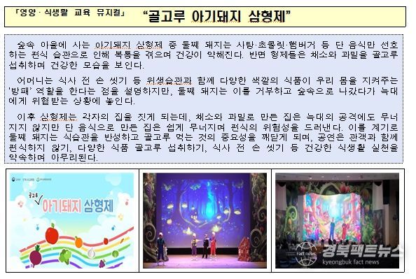 참고로 교육부는 현장소통단의 의견을 수렴하여, 2024년부터 유아의 눈높이에 맞춘 교육용 뮤지컬을 개발해 찾아가는 공연 사업을 추진하고 있다. 올해도 식문화 이해와 긍정적인 식습관 형성을 주제로 하는 새로운 뮤지컬을 개발하여 현장 교육을 지원할 계획이다.