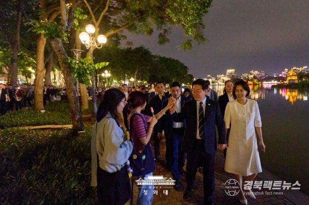 경북팩트뉴스 황혜경 기자 | 베트남을 국빈 방문한 이재명 대통령과 김혜경 여사는 23일(현지시간) 저녁 하노이 호안끼엠 호수 인근 구시가지를 깜짝 방문해 베트남 국민들과 소통하며 저녁 시간을 함께했다고 안귀령 부대변인이 서면 브리핑했다.