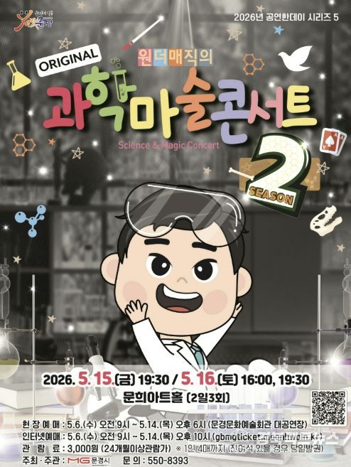 경북팩트뉴스 남유신 기자 | 문경문화예술회관에서는 5월 어린이 달을 맞아 마술과 과학의 경계를 넘나들며 온가족 모두가 재미있게 관람할 수 있는 과학마술콘서트 시즌2 공연을 5월 15일 19:30, 16 16:00, 19:30 (2일 3회)에 문희아트홀에서 개최한다.