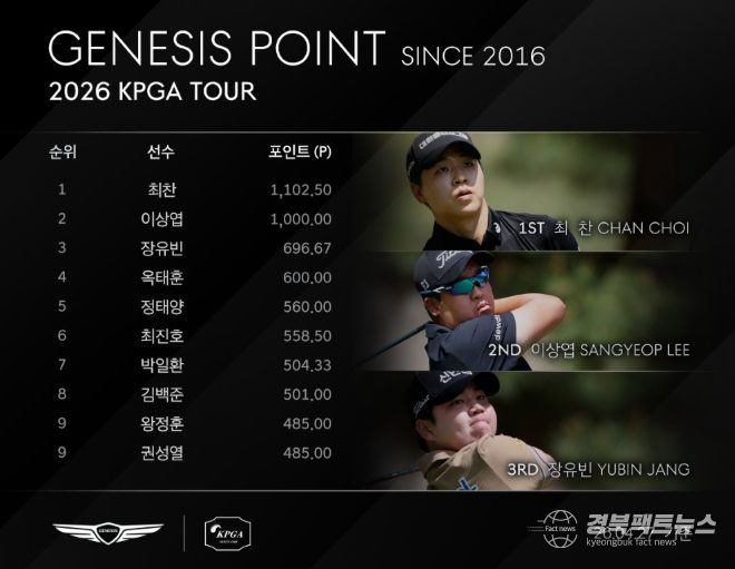 최찬은 ‘2026 우리금융챔피언십’에서 최종합계 13언더파 271타로 우승해 제네시스 포인트 1,000 포인트를 추가한 1,102.50 포인트로 단숨에 제네시스 포인트 1위에 올라섰다. 최찬이 제네시스 포인트 1위에 위치한 것은 2022년 투어 입성 이후 최초다.