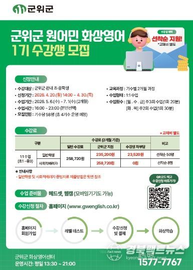 경북팩트뉴스 남유신 기자 | 군위군은 관내 초·중학생의 영어 능력 향상과 사교육비 부담 완화를 위해 ‘1:1 원어민 화상영어’ 프로그램 1기 수강생을 4월 30일까지 선착순 모집한다고 밝혔다.