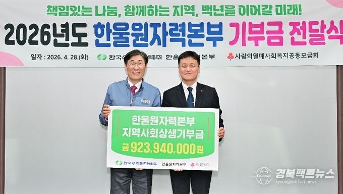 경북팩트뉴스 남유신 기자 | 한국수력원자력(주) 한울원자력본부는 창립 25주년을 맞아 4월 28일(화) 경북사회복지공동모금회에 총 9억 2천 3백만원의 기부금을 전달했다.