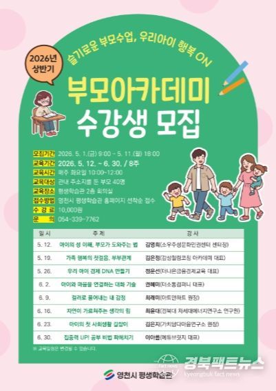 경북팩트뉴스 남유신 기자 | 영천시 평생학습관은 5월 1일부터 11일까지 ‘2026년 상반기 부모아카데미’ 수강생을 모집한다.