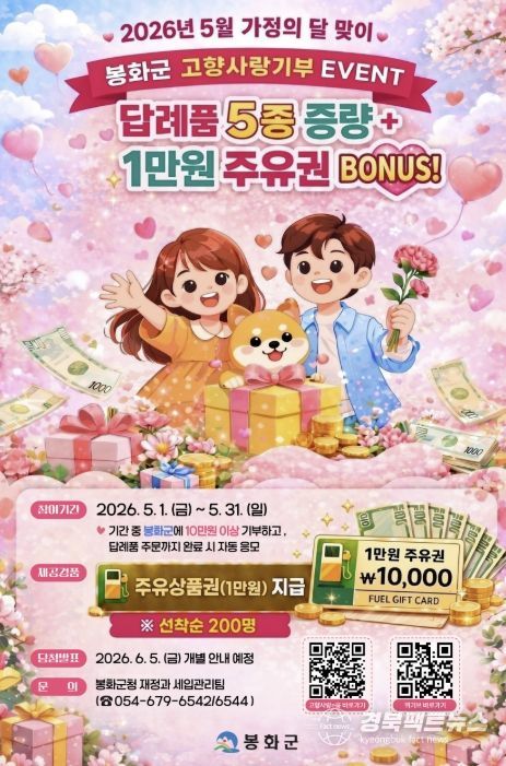 경북팩트뉴스 남유신 기자 | 봉화군은 5월 가정의 달을 맞이하여 고향사랑기부제 활성화를 위해 5월 1일부터 31일까지 1개월간 “답례품 UP ! 주유권 BONUS !”란 주제로 고향사랑기부제 경품 이벤트를 진행한다.
