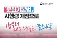 경북팩트뉴스 이경원 기자 | 「문화기본법」 시행령 개정으로 4월부터 매주 수요일은 '문화요일' - 3월 3일(화) 「문화기본법」 시행령 개정안 국무회의 의결 '문화가 있는 날'을 매달 마지막 수요일에서 '매주 수요일'로 확대하는 「문화기본법」 시행령 개정안이 3월 3일(화) 국무회의에서 의결됐습니다. ■ 모두가 함께 만드는 '수요일 특화 문화프로그램' - 민간 기관 수요일 문화프로그램을 운영하고자 하는 모든 민간 기관은 '문화요일' 참여 기관으로 등록 가능 - 국공립 문화예술기관 기관별 특색을 살린 '수요일 특화 기획 프로그램'을 강화해 일상 속 문화 향유 기회 확대 - 지자체 일부 지자체에서는 한옥, 농악, 공방 등 지역 고유의 문화 자산과 연계한 '지역 특화 프로그램' 강화 ■ 온라인 문화향유 기회 확대 국민들이 '문화가 있는 날'을 일상에서 체감할 수 있는 온라인 소통의 장을 마련하고, 매주 수요일이 '나의 문화요일'로 자리 잡을 수 있도록 다채로운 참여 행사 진행 ■ 업계의 자율성에 따른 문화혜택 운영 일회성 지원 확대보다 현장의 자율성과 지속 가능성을 존중하는 방향