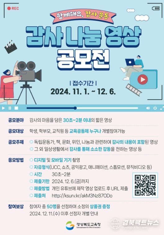 경북팩트뉴스 조현묵 기자 | 경북교육청은 다음 달 6일까지 학생과 학부모, 교직원 등 교육공동체를 대상으로 ‘2024 감사 나눔 영상 공모전’을 진행한다고 8일 밝혔다.