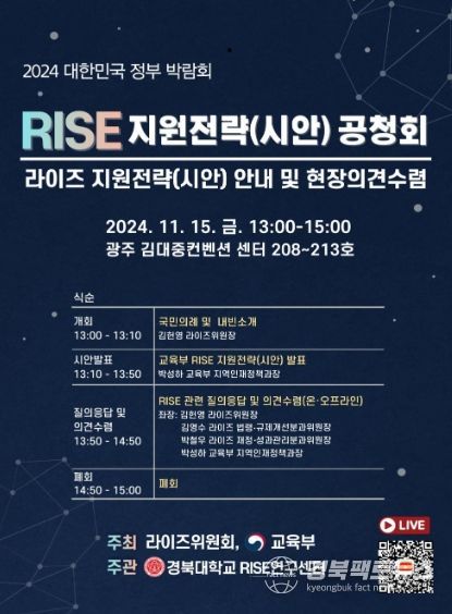 경북팩트뉴스 조현묵 기자 | 교육부와 라이즈위원회는 11월 15일 김대중컨벤션센터(광주)에서 ‘라이즈 지원 전략(시안)’에 대한 대국민 공청회를 개최한다.