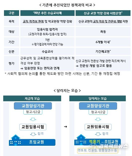 교육부와 시범운영 교육청은 신규 교원이 학교에 적응하고 교직 전문성을 제고할 수 있는 역량 강화 프로그램 등을 함께 마련하고, 운영 전반에 걸쳐 연구·분석을 병행하여 시범운영의 효과성을 검증하고 개선 필요 사항 등을 도출할 예정이다.