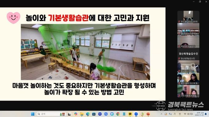 경북교육청은 이를 반영해 11월 25일부터 내년 2월까지 매월 1회 연수 과정을 마련해 놀이중심 교육과정 운영 사례를 공유하며, 교원학습공동체 운영을 지원한다.