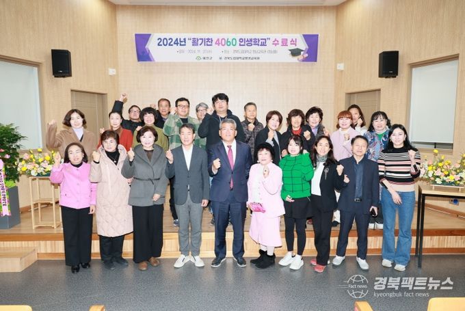 경북팩트뉴스 김영란 기자 | 예천군은 지난 27일 오후 7시 경북도립대학교 청남교육관에서 수료생과 관계자 40여 명이 참석한 가운데 ‘활기찬 4060 인생학교’ 수료식을 개최했다.