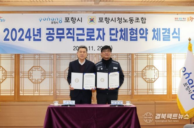경북팩트뉴스 김영란 기자 | 포항시가 29일 시 소속 공무직 근로자를 대표하는 포항시청노동조합과 ‘2024년 공무직 근로자 단체협약 체결식’을 개최했다.