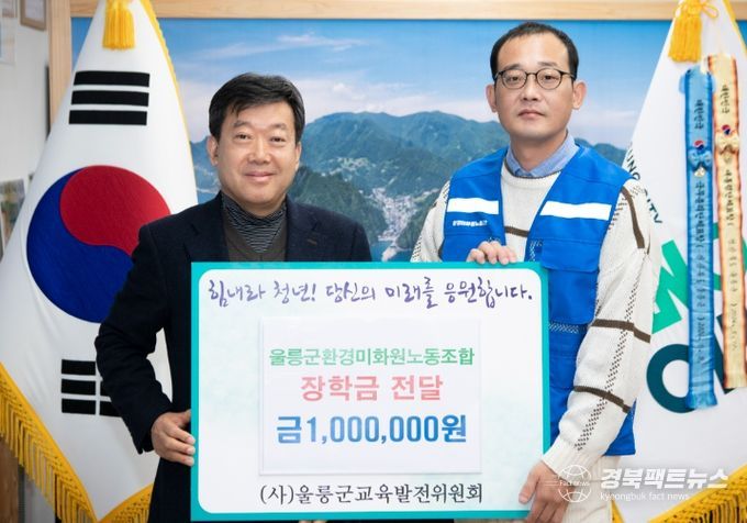 경북팩트뉴스 김영란 기자 | 지난 6일 울릉군환경미화원노동조합은 우리 지역 학생들을 위해 (사)울릉군교육발전위원회(이사장 한익현)에 장학금 100만원을 기탁했다.