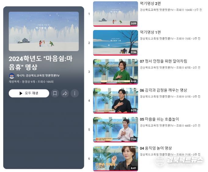 경북팩트뉴스 조현묵 기자 | 경북교육청이 학생들의 마음 건강 위기를 예방하고 정서적 안정을 돕기 위해 맞춤형 명상 자료 ‘마음쉼:마음휴’를 제작해 공개했다고 11일 밝혔다.