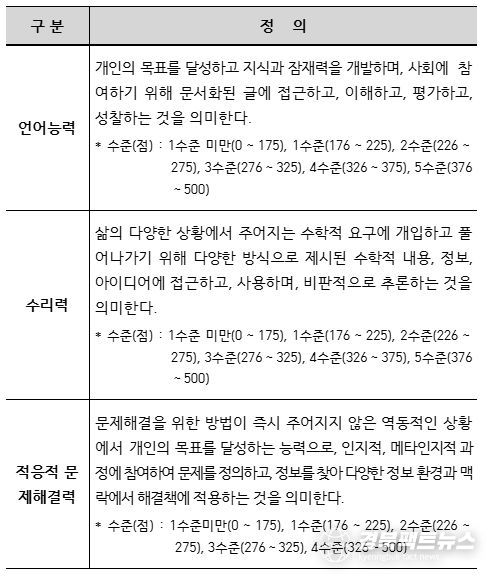 우리나라 16~65세 성인의 언어능력 평균 점수는 249점, 수리력은 253점, 적응적 문제해결력은 238점으로 세 영역 모두 OECD 평균보다 낮았다.