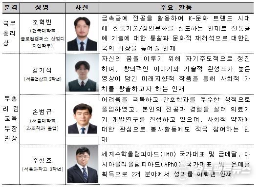 ‘2024 대한민국 인재상’ 수상자로 지역심사와 중앙심사를 거쳐 전국의 우수 인재 100명(고교 50명, 대학·일반 50명)이 최종 선발되었으며, 이 중 1명은 국무총리상(상금 3백만 원)을, 99명은 부총리 겸 교육부 장관상(상금 2백만 원)을 수상한다.