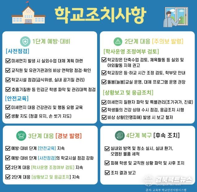 또 학교는 △미세먼지 담당자 지정 △예․경보 상황 상시 확인과 상황 교내 전파 △미세먼지 대응 상황 자체 점검 체크리스트 작성과 제출 △미세먼지 대응 계기 교육 시행 △체육활동 등 실외 활동 자제 △비상저감조치 발령 시 차량 2부제 실시 △공기정화장치 가동 △실외 수업 자제, 수업 시간 조정, 등․하교 시간 조정, 임시휴업 등 실시와 조치 결과 보고 △호흡기 질환 등 민감군 학생 건강 상태 수시 점검 등의 조치를 시행하게 된다.