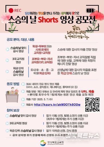 올해 스승의 날 행사의 핵심 메시지는 ‘당신이라는 햇살을 만나, 우리는 새싹에서 꽃으로’로, 교사의 따뜻한 가르침과 헌신에 감사하고 존경의 마음을 전하는 뜻을 담고 있다. 이 메시지를 중심으로 스승 존경, 제자 사랑 풍토를 조성하기 위해 경북교육청 주관 스승의 날 Shorts 영상 공모전이 진행된다.