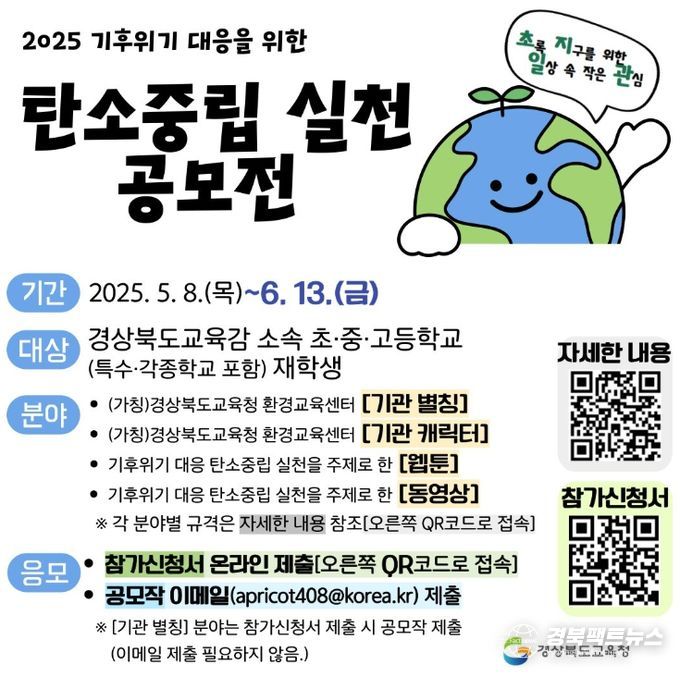 경북팩트뉴스 조현묵 기자 | 경북교육청은 ‘제4회 환경교육주간(환경의 날, 6월 5일)’을 맞아, 도내 초․중․고등학교(특수 및 각급학교 포함) 학생들을 대상으로 ‘2025 기후 위기 대응을 위한 탄소중립 실천 공모전’을 개최한다고 8일 밝혔다.