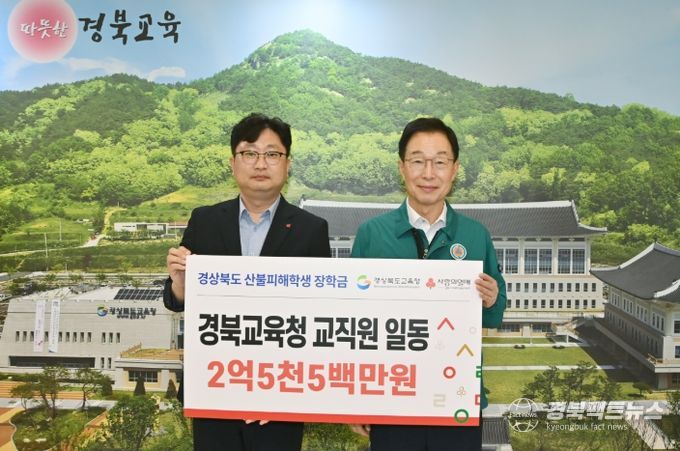 경북팩트뉴스 남유신 기자 | 경북교육청은 지난 3월 경북 지역에서 발생한 초대형 산불로 큰 피해를 본 5개 지역 학생들을 지원하기 위해, 교육청 소속 교직원들이 자발적으로 모은 성금 2억 5,500만 원을 경북사회복지공동모금회에 전달했다고 8일 밝혔다.