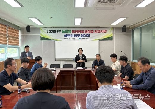 경북팩트뉴스 조현묵 기자 | 고령군은 2025년 5월 19일 월요일 14:00 농업기술센터 소회의실에서 농협중앙회 고령군지부, 지역농협 등 유관기관 관계관이 모인 가운데 '농작물 무인항공 병해충 항공방제 하반기 업무협의회'를 개최했다.