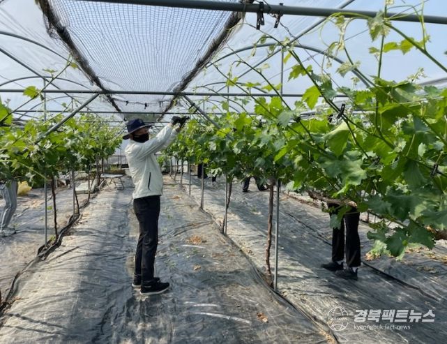 경북팩트뉴스 조현묵 기자 | 김천시 개령면은 5월 20일 직원 10여 명이 참여한 가운데, 본격적인 봄철 농번기를 맞아 일손 부족으로 어려움을 겪고 있는 관내 포도 재배 농가를 방문해 포도 순 자르기 작업을 지원했다.