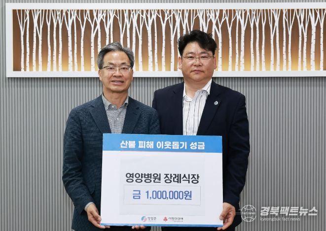 경북팩트뉴스 조현묵 기자 | 영양병원 장례식장(대표 장오용)은 지난 5월 14일, 영양군 산불 피해 복구와 이재민 지원을 위해 성금 100만 원을 영양군에 기탁했다.