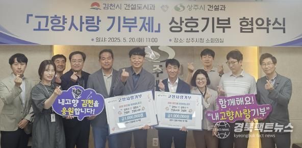 경북팩트뉴스 조현묵 기자 | 상주시 건설과에서는 5월 20일, 11:00 상주시청 소회의실에서 김천시 건설도시과와 부서 관계자들이 참석한 가운데‘고향사랑 기부제’상호기부 협약식을 가졌다.