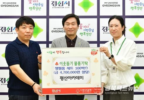 경북팩트뉴스 조현묵 기자 | 경북 칠곡군 소재 평산아카데미는 21일 경산시청을 방문하여 관내 어려운 이웃을 위해 470만원 상당의 생필품 세트 100박스를 기탁했다.