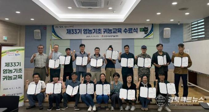 제33기 영농기초 귀농 교육은 영농 5년 미만의 신규 및 예비 농업인을 대상으로 지난 4월 7일부터 5월 21일까지 12회 48시간으로 진행됐으며, 김천시 주산작목 기초 영농 기술교육, 농산물 마케팅, 농업법률, 경영관리 등의 내용으로 구성되어 영농 초기 농업인들을 위한 기초과정으로 추진됐다.