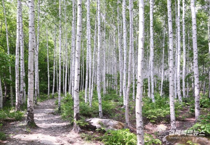 경북팩트뉴스 조현묵 기자 | 따사로운 햇살에 피어오른 녹음이 가득한 영양군(군수 오도창) 죽파리 자작나무숲은 여름이면 하얀 줄기와 푸른 잎사귀의 조화가 절정을 이룬다.