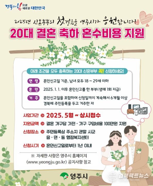 경북팩트뉴스 조현묵 기자 | 영주시는 결혼을 장려하고 청년층의 경제적 부담을 덜기 위해 오는 5월 26일부터 20대 신혼부부를 대상으로 “20대 결혼 축하 혼수비용 지원사업”을 본격 시행한다고 밝혔다.