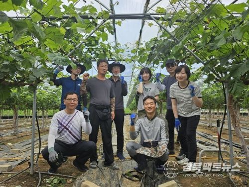 경북팩트뉴스 조현묵 기자 | 김천시 원도심재생과 직원들은 지난 22일 조마면의 한 포도 재배 농가에서 농촌 일손 돕기 봉사활동을 실시했다.