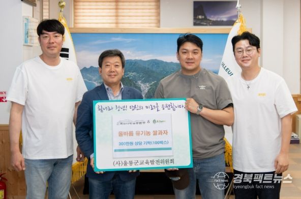 경북팩트뉴스 조현묵 기자 | 지난 23일 금요일 15시 울릉군청을 방문한 (사)독도사랑운동본부(총재 노상섭)와 올바름(대표 김정광)은 (사)울릉군교육발전위원회(이사장 한익현)에 300만원 상당의 유기농 쌀과자 100박스를 전달했다.