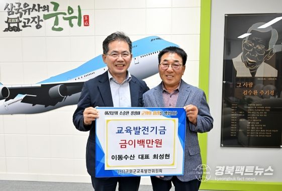 경북팩트뉴스 조현묵 기자 | 군위 이동수산(대표 최성현)는 지난 22일 군위군청을 방문하여 지역의 교육 발전과 인재양성을 위해 써달라며 교육발전기금 200만원을 기탁했다.