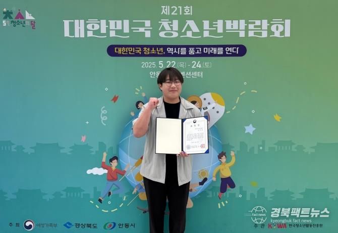경북팩트뉴스 조현묵 기자 | 안동시시설관리공단에서 운영하는 안동시청소년수련관 청소년운영위원회 위원장 심재현(고등학교 2학년) 군이 여성가족부가 주관하는 ‘2025년 청소년 육성 및 보호 유공’ 청소년 부문에서 장관 표창을 수상했다.