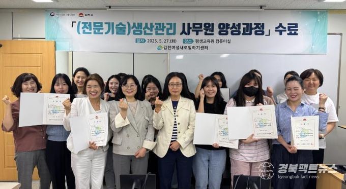 경북팩트뉴스 조현묵 기자 | 김천시평생교육원 여성새로일하기센터는 5월 27일 평생교육원 컴퓨터실에서 국비 공모 사업으로 추진된 직업교육훈련 『(전문기술)생산관리 사무원 양성 과정』의 수료식을 개최했다.