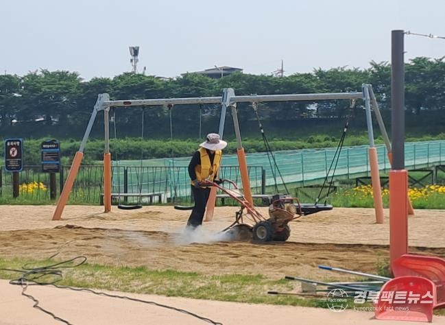 경북팩트뉴스 조현묵 기자 | 영주시는 5월 28일 어린이들이 안전하고 쾌적하게 뛰놀 수 있는 환경을 조성하기 위해 조성한 ‘아이! 신나 강바람놀이터’를 대상으로 모래 소독 및 안전 검사를 실시했다.