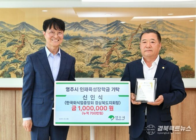 경북팩트뉴스 조현묵 기자 | 영주시인재육성장학회는 지난 28일, 신인식 한국외식업중앙회 경상북도지회장과 지역 기업 칠공사가 지역 인재 육성을 위한 뜻깊은 마음을 담아 각각 장학금 100만 원을 기탁했다고 밝혔다.