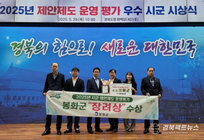 경북팩트뉴스 조현묵 기자 | 봉화군은 29일 경상북도가 주관한 ‘2025년(2024년 실적) 시군 제안제도 운영 평가’에서 장려상을 수상하며 12년 연속 우수기관으로 선정되는 쾌거를 이뤘다.