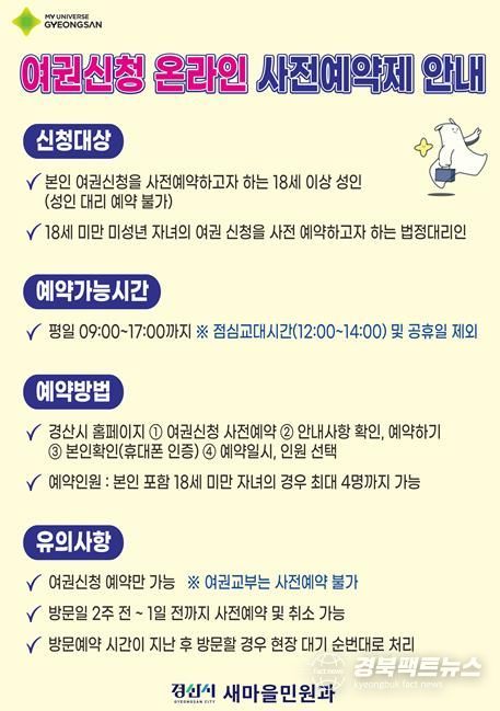경북팩트뉴스 조현묵 기자 | 경산시는 민원인의 편의 증진과 현장 대기시간 단축을 위해 오는 6월 2일부터 ‘여권신청 온라인 사전예약제’를 시행한다.