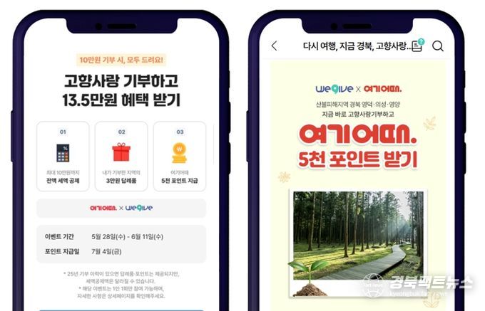 이번 이벤트는 고향사랑기부제 민간플랫폼‘위기브’와 여행 플랫폼‘여기어때’의 공동 기획으로, 산불 피해지역 관광 활성화와 지역 경제 회복을 목적으로 진행된다.