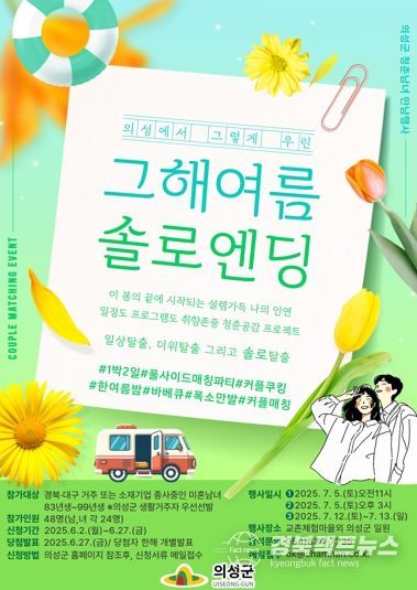 경북팩트뉴스 조현묵 기자 | 의성군은 미혼 청년이 자연스럽게 교류할 수 있는 만남의 장을 제공하고, 결혼에 대한 긍정적인 인식을 확산함으로써 출산 장려 분위기를 조성하고자 미혼남녀 만남 지원 행사인 ‘그해 여름 솔로 엔딩’의 추진하며 참가자를 모집하고 있다.