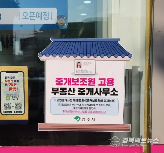 경북팩트뉴스 조현묵 기자 | 영주시는 공인중개사 사무소 중 중개보조원을 고용한 업소에 ‘중개보조원 고용 업소 안내 스티커’를 제작·배부한다고 2일 밝혔다.