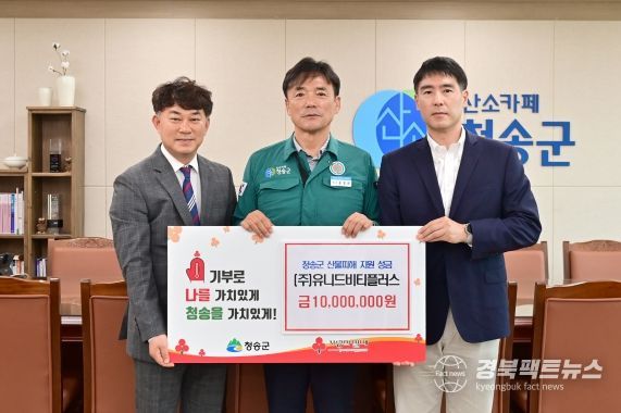 경북팩트뉴스 조현묵 기자 | 청송군은 지난 5월 30일, ㈜유니드비티플러스(대표 이우신)가 청송군 산불 피해 이재민을 돕기 위해 1,000만 원의 성금을 전달했다고 밝혔다.