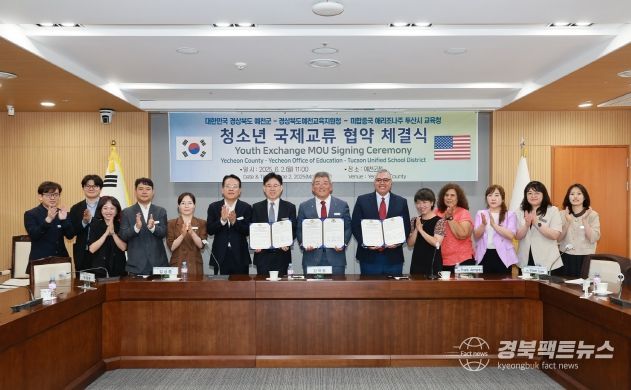 경북팩트뉴스 조현묵 기자 | 예천군은 6월 2일 11시 예천군청에서 미국 애리조나주 투산시 교육청(Tucson Unified School District), 경상북도예천교육지원청과 함께 청소년 국제교류 협력을 위한 양해각서(MOU)를 체결했다.