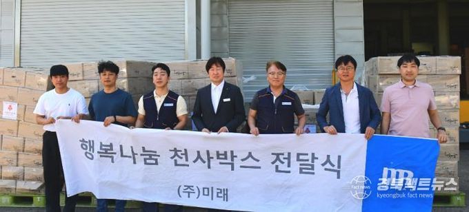 ㈜미래는 김천시 개령면에 위치한 자동차 배터리 케이스 및 커넥터 등을 생산하는 기업으로, 해마다 지역사회를 위한 꾸준한 나눔 활동을 펼치며 사회적 책임을 실천하고 있다.