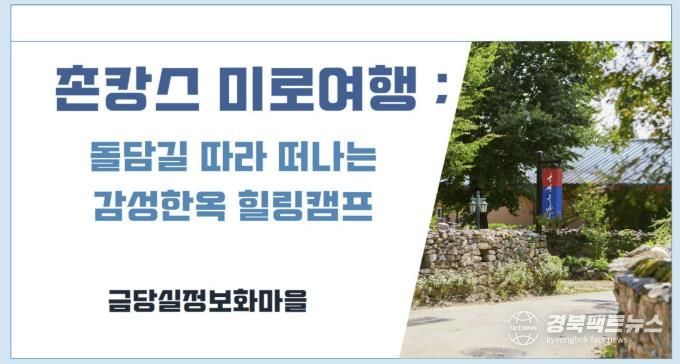 금당실정보화마을은 ‘촌캉스 미로여행: 돌담길 따라 떠나는 감성한옥 힐링캠프’를 제안해 공모전에 선정됐다. ‘촌캉스 미로여행’은 전통 한옥마을인 금당실의 아름다운 골목길과 전통문화 미션, 한옥숙박, 전통음식 체험 등으로 구성된 체험형 관광상품으로 구성되어 있다.