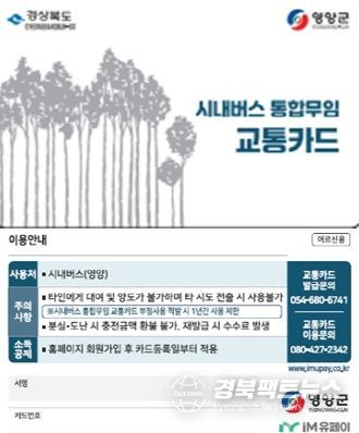 단, 신청자가 기존 우대 교통카드(경로‧장애인‧국가유공자)를 소지했을 경우 영양군 무임교통카드 발급과 동시에 기존의 교통카드 기능이 해지 될 수 있으니 발급 신청 시 주의하여야 하며 신청 시 담당자의 설명을 듣고 발급 여부를 선택하면 된다.