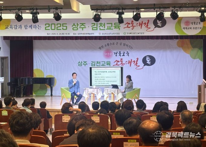 경북팩트뉴스 남유신 기자 | 경상북도김천교육지원청은 6월 24일 김천학생문화예술센터에서 김천시장, 도의회 의원, 시의회 의장을 비롯한 김천, 상주 지역 각급 학교장, 학교운영위원장협의회장, 학부모회협의회 대표, 녹색어머니회, 학부모자원봉사자회, 주민감사관, 교육계 원로, 교육발전특구 관계자 등 교육가족 240여 명을 초청하여 ‘2025 교육감과 함께하는 상주·김천교육 소통대길 톡’을 개최했다.